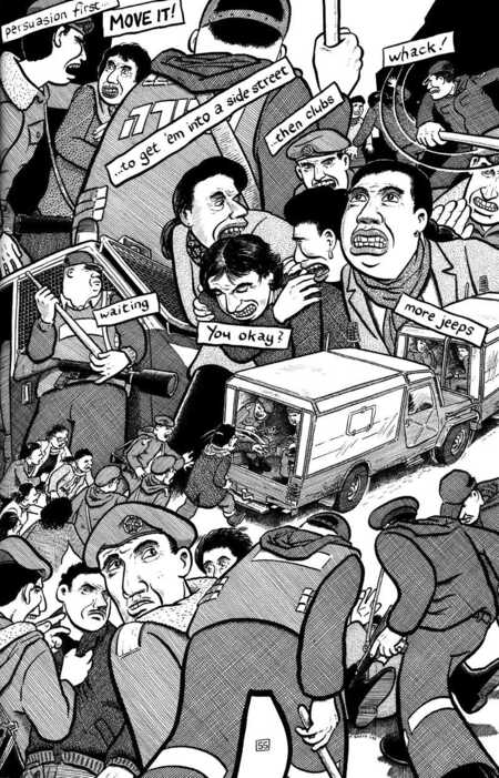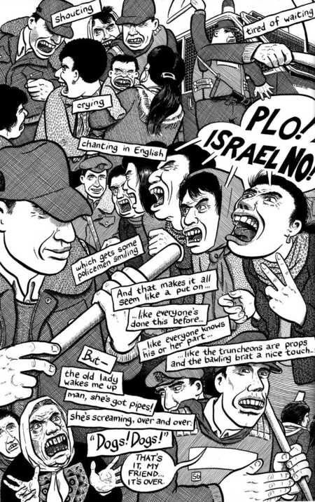 Точно по такой же причине, что и у Мауса, Джо Сакко добавляет себя как персонажа. Мы знакомимся с его нарисованным «Я» с первых страниц истории и читаем так много его размышлений над происходящим, что не остаётся никаких сомнений, что история реальна.