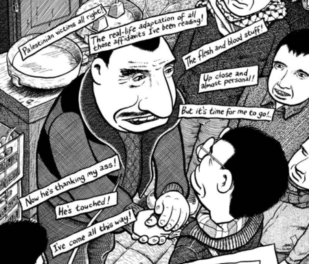 Джо Сакко использует гротескный, иногда даже карикатурный стиль в «Палестине» специально, чтобы подчеркнуть остроту, напряжённость и хаотичность жизни в конфликтной зоне. Его нарочито «некрасивые» персонажи и перегруженные деталями сцены отражают усталость и постоянный стресс, которые испытывают обычные люди в Газе. В результате у читателя остаётся ощущение реальности: показывается не «нейтральная» хроника, а честный взгляд вовлечённого свидетеля, которому не всё равно.