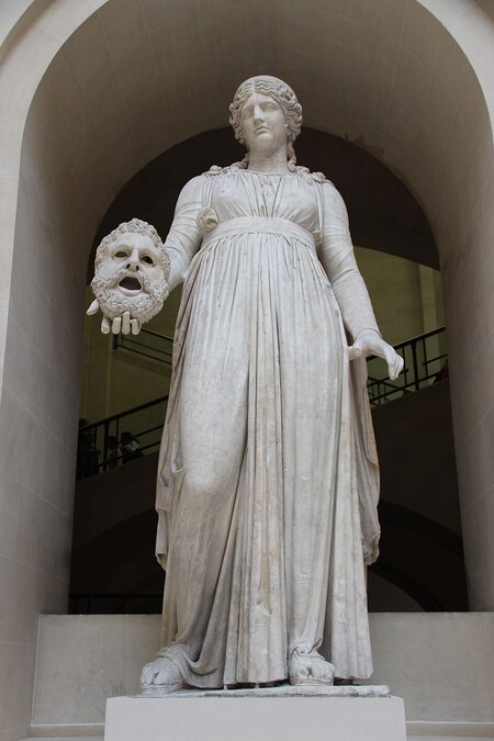 Мельпоме́на (др.-греч. Μελπομένη) — в древнегреческой мифологии муза трагедии. Одна из девяти дочерей Зевса и Мнемосины, мать сирен (от Ахелоя). Изображалась в виде женщины с повязкой на голове и в венке из листьев винограда или плюща, в театральной мантии, с трагической маской в одной руке и мечом или палицей в другой (символ неотвратимости наказания человека, нарушающего волю богов). Она была не только покровительницей трагедии, но и матерью обладательниц чарующих голосов. Тогда Мельпомена, сожалеющая о судьбе дочерей, навечно обрела свои атрибуты: трагическую маску, театральную мантию и меч как напоминание о неотвратимости наказания для тех, кто нарушает волю богов. Через катастрофы и неудачи муза познала трагедию со всех сторон, но всегда в трагедии рождается торжество человеческого духа, что и показывает Мельпомена людям.