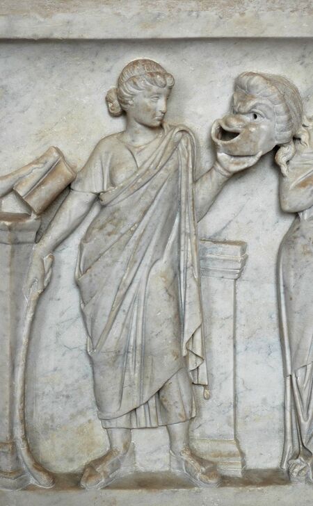 Справа: Барельеф музы комедии Талии с театральной маской на античном саркофаге, 150 Слева: Талия, муза комедии. Мрамор, римское произведение искусства II века н. э.
