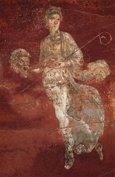 Слева: муза комедии Талия с комической маской и пастушьим посохом.Фреска IV стиля. Эпоха Нерона (54—68 гг.). Справа: Фреска с изображением музы Мельпомены (Трагедия), Эдвард Симмонс, 1896