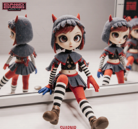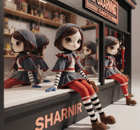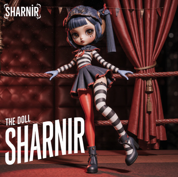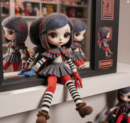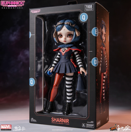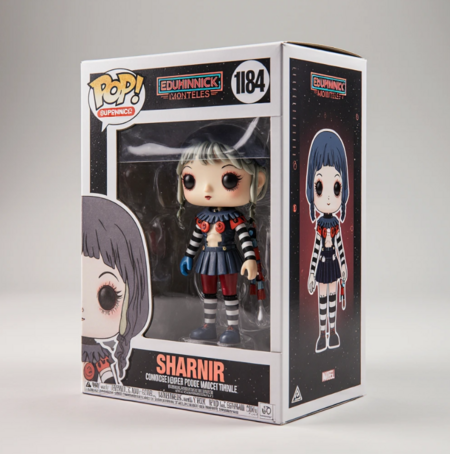 Transform this 3D model into a realistic collectible doll packaged like a premium toy from popular brands such as Funko Pop or designer vinyl figure lines. Create a detailed, well-lit retail box with a large transparent window showing the full character inside. Keep accurate proportions and vibrant, true-to-character colors. The box should feature professional printed graphics, brand-style layout, and the name ‘SHARNIR’ clearly displayed on the front and sides. Use realistic lighting, soft shadows, and a clean studio background for a high-quality product photography look. Emphasize authenticity, collectible appeal, and a sense of craftsmanship.