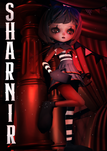 Logo design for a boutique puppet shop named SHARNIR, inspired by dark theatre aesthetics and Tim Burton’s whimsical gothic style. The logo should feel handcrafted and artistic, with elegant yet slightly eerie typography. Use a deep color palette of crimson red and dark teal, accented with subtle black-and-white striped or checkered motifs. Incorporate delicate textures reminiscent of wood, fabric, or aged paper, with warm, dramatic lighting and a sense of depth. The design should look professional and polished, suitable for branding and packaging — mysterious, refined, and visually captivating, without black borders or harsh outlines.