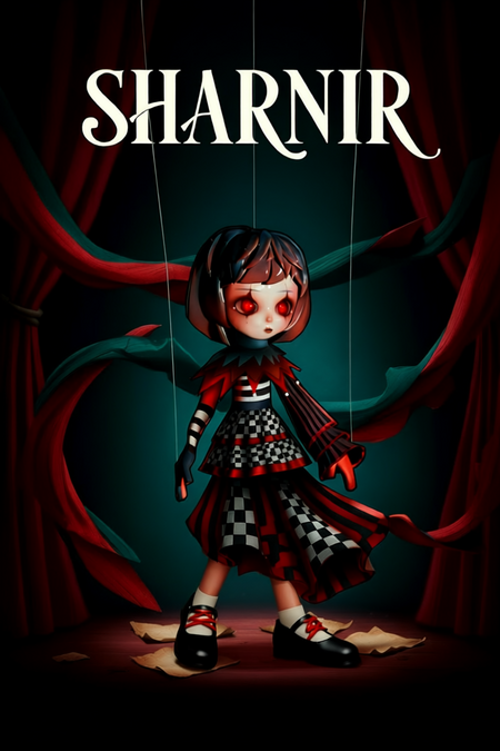 Design a modern puppet theatre cover and poster series for SHARNIR THE DOLL. The mood is darkly whimsical and theatrical — inspired by Tim Burton’s gothic aesthetics, blending elegance with a touch of strangeness. Use a deep color palette of crimson red and dark teal, with black-and-white striped and checkered patterns adding rhythm and contrast. The composition should feel dynamic and alive — dramatic lighting, motion in fabrics or puppet strings, and a sense of stage performance. Combine handcrafted textures like wood, fabric, and aged paper with a modern artistic touch. The overall style should feel both mysterious and creative — refined, slightly eerie, yet visually captivating.