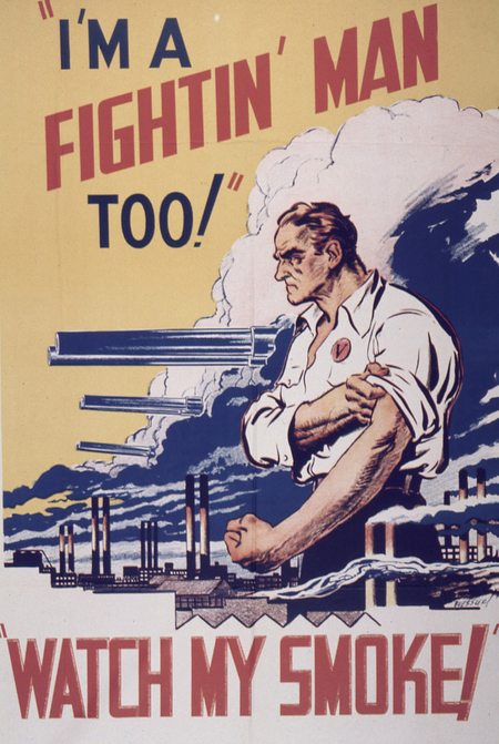 В обоих плакатах фигурирует образ труженика тыла, однако в советском герой похож на того, кого можно встретить на заводе, а в американском суровое лицо мужчины и его крупная спортивная фигура создают некий идеализированный образ. Здесь ситуация обратная первой паре плакатов — советский вариант, хоть и в сильно ограниченной цветовой гамме, изображает довольно реалистичное лицо с убедительной светотенью, отсутствует драматичная контрастность. В американском же случае графика совершенно плакатная, плоскостная, и фон теперь сложный и метафоричный здесь. Типографика на плакатах имеет сходства: красный цвет и положение, центру, но в американском она более динамична. Советский плакат взывает к чувству гордости и причастности, а американский — тоже к причастности, но яростной.