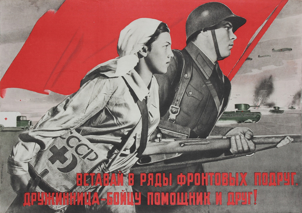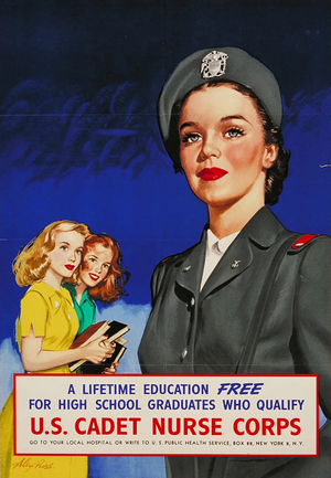В. Корецкий «Вставай в ряды фронтовых подруг. Дружинница — бойцу помощник и друг!», 1942 г. А. Росс «A lifetime education free for high school graduates who qualify: U.S. Cadet Nurse Corps», 1945 г.