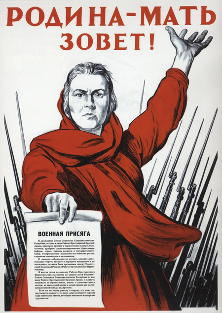 Советский плакат состоит всего из трех цветов, сочетание которых сразу же взывает к эмоциональному. Героиня обращается не только к человеку перед плакатом, а ко всем гражданам СССР, она и сама не конкретный человек, а образ Отчизны. Графичные линии бескомпромиссны, на ярко-красных одеждах женщины тени порой сливаются в черные пятна, создавая драматичный эффект. Красная надпись сверху расположена по центру, она делает композицию более уравновешенной, от нее по руке, поднятой вверх и призывающей к всеобщему подъему, взгляд доходит до белого пятна с присягой. Здесь красный — не столько отсылка к флагу, сколько к идее борьбы за Родину и любви к ней.