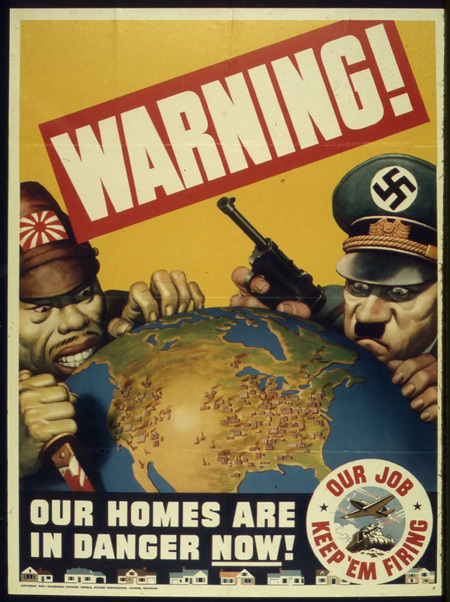 На первой работе графика плоскостная, плакатная, что позволяет считать смыслы на чувственном уровне очень быстро. На американском плакате иной подход, графика вполне реалистичная, проработана светотень. Лица Гитлера и Тодзё узнаваемы, враг персонифицирован, готов атаковать. Цветовая гамма разнообразна: желтый, красный, зеленый, голубой, черный, белый, коричневый, — такое обилие цветов делает показанное на плакате менее метафоричным и более осязаемым. Оба героя плаката находятся за светлой и яркой планетой, ногти одного болезненно впиваются в Землю; важна их атрибутика: Тодзё держит окровавленный нож, а Гитлер наверянка заряженный пистолет, что кричит об их намерениях. На советском плакате девушка уже подвешена на веревке, злодеяние случилось, также она частично оголена, что заставляет смотрящего додумывать страшные действия, которые мог совершить фашист.