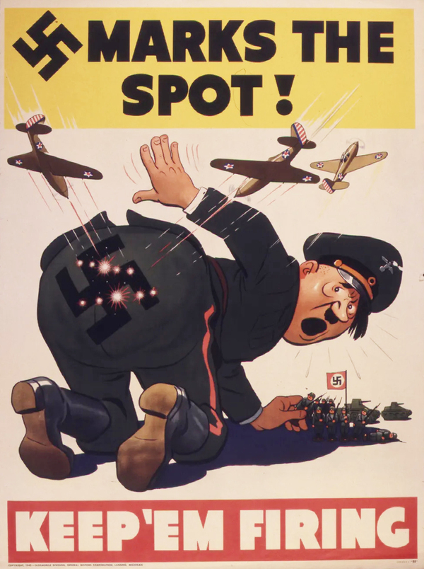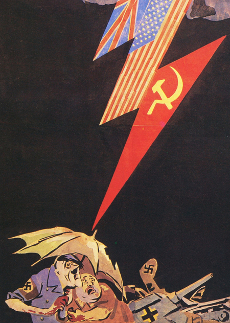 На этой паре плакатов образ врага не призван вызывать страх. На советском посыл считывается на уровне композиции — черная фигура Гитлера приникает к нижнему левому углу в беспомощной позе, в то время как здоровый и крепкий солдат находится в правом верхнем, так наглядно показано превосходство СССР над врагом как в моральном плане, так и в физическом. Поза уничижительна и у Гитлера на американском плакате, он находится в уязвимом положении, в позе подчинения, как животное. Безуспешны и его попытки «отмахнуться» от американских самолетов. Такая демонстрация врага показывает зрителю, насколько просто победить врага.