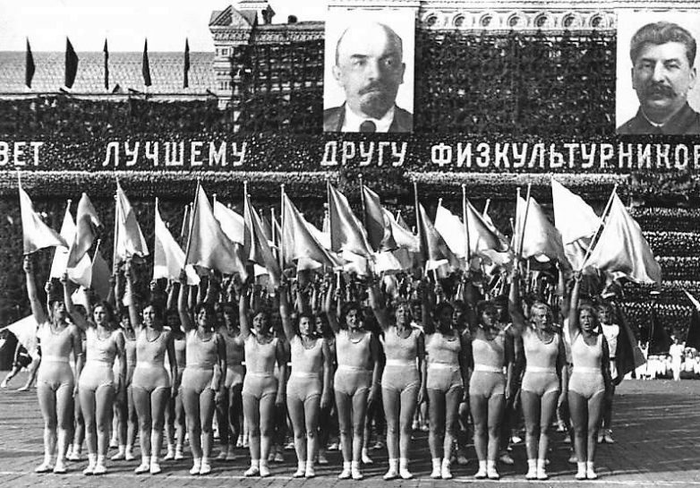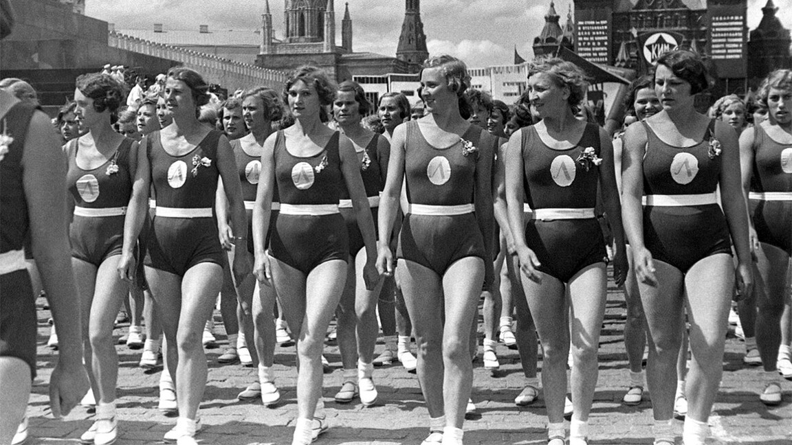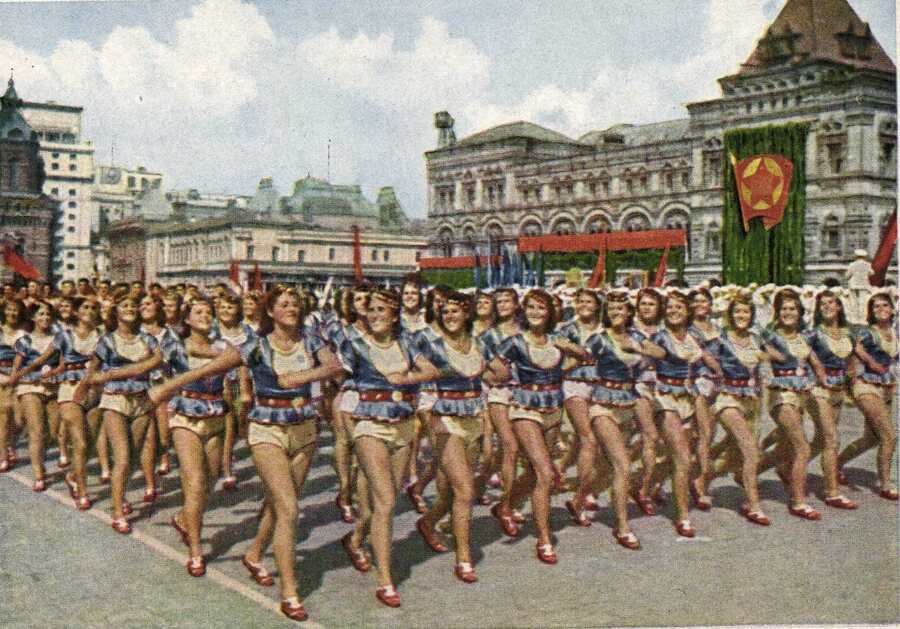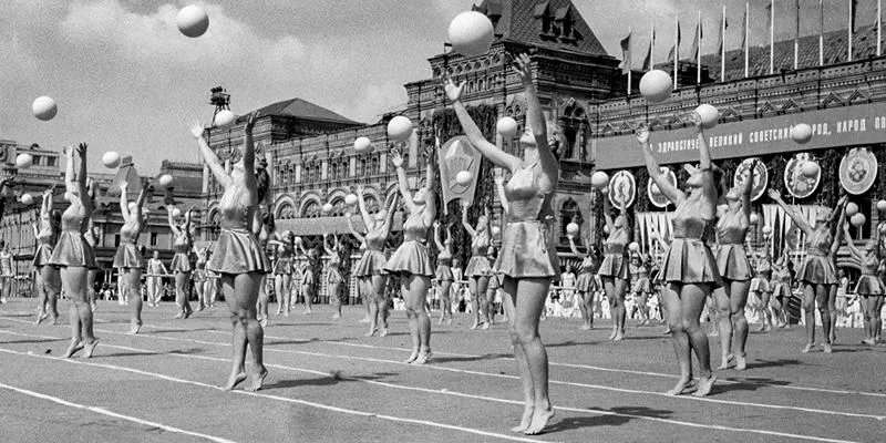 Массовые физкультурные парады стали одним из ярких проявлений визуальной культуры СССР. В парадах участвовали тысячи людей. Их движения синхронизировались и превращались в огромные динамические рисунки. Важную роль играла точность исполнения. Индивидуальные жесты растворялись в общей схеме. Тело становилось частью общей композиции. Такие построения создавали эффект живой графики. С высоты стадиона или с трибун можно было видеть фигуры, слова, круги и диагональные линии, которые формировали участники. Танец в этом контексте превращался в инструмент визуального воздействия.