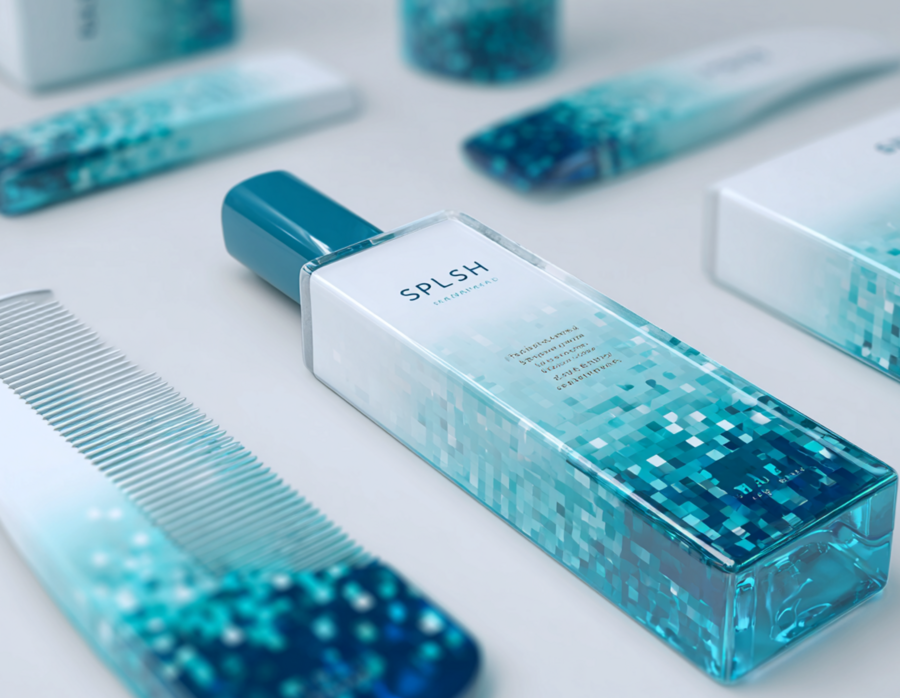Product photo of «SPLSH» shampoo bottles in minimalist pixel-inspired design. Clean, modern packaging with square pixel pattern details and subtle water-inspired texture. Color palette: FFFFFF, 73BCD9, 3987A6, 20638D. Typography in Helvetica, clear and balanced layout. Realistic photo render on white background, professional studio light, 16:9 format. Include several bottle sizes (tall shampoo, smaller conditioner, tube). Branding printed with SPLSH logo in Helvetica, clean composition, no mockup, focus on packaging design.