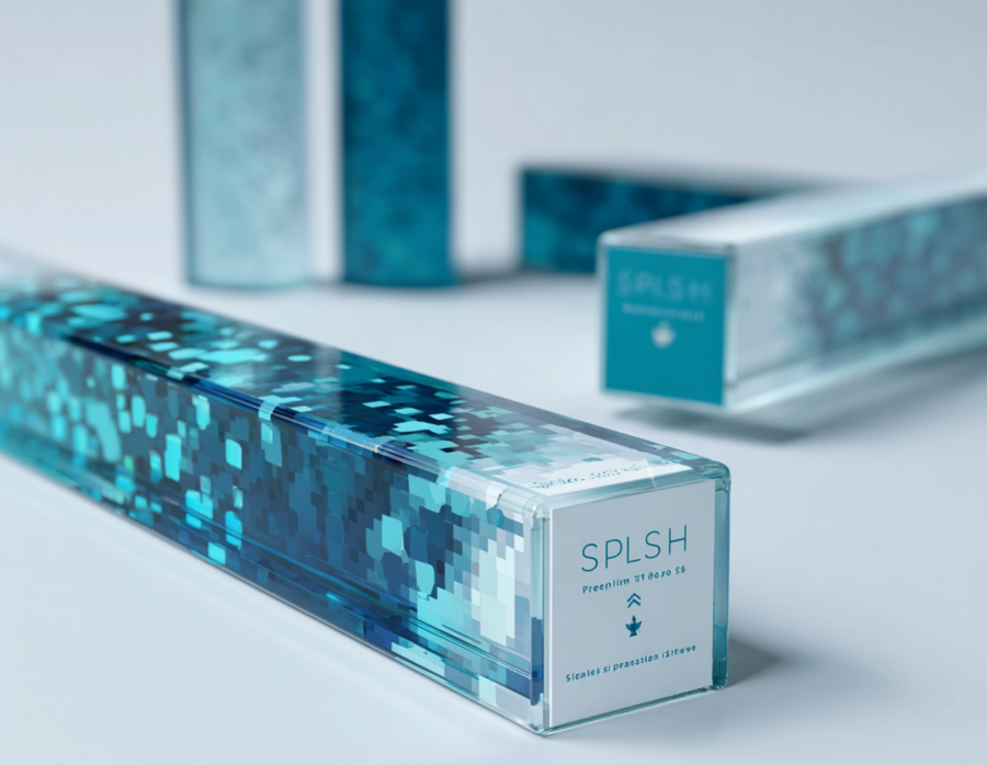 Product photo of «SPLSH Reflection» perfume square transparent glass bottle with geometric pixel embossing and minimal Helvetica label. White and turquoise color palette, clean studio lighting, realistic composition, 16:9 ratio.