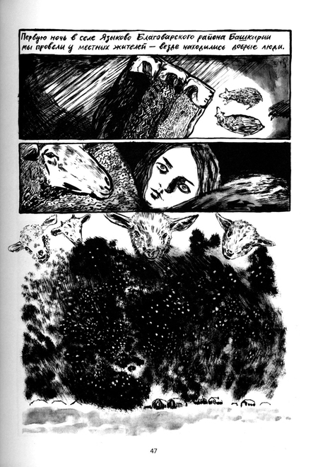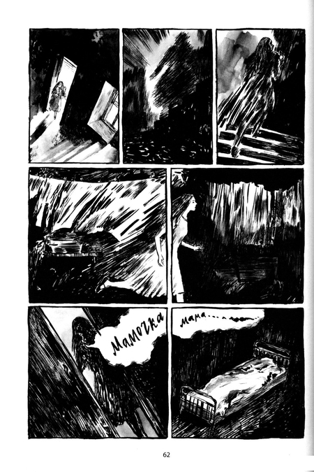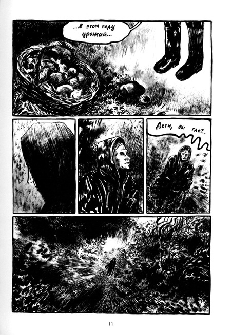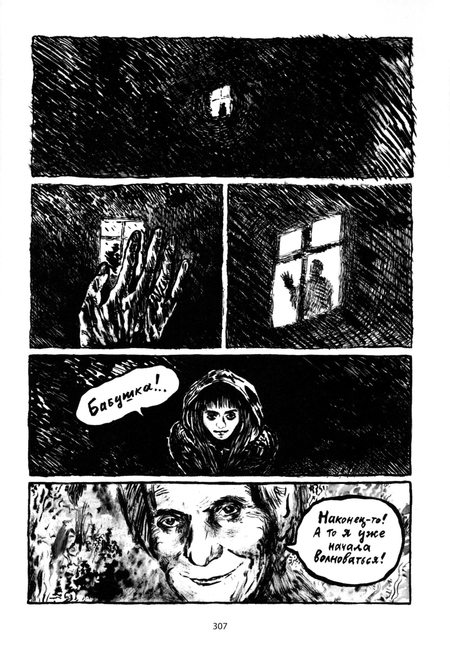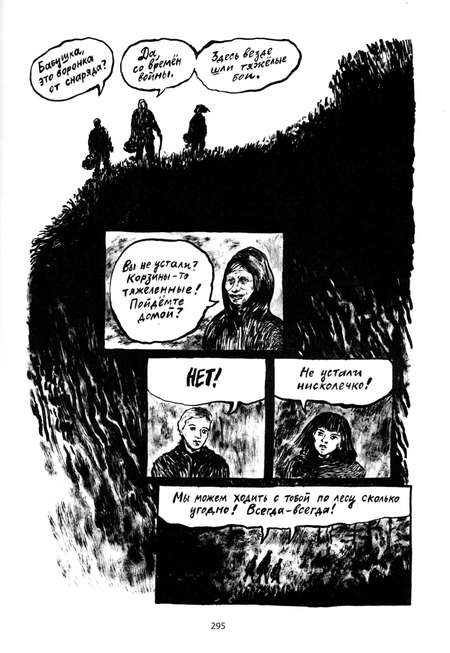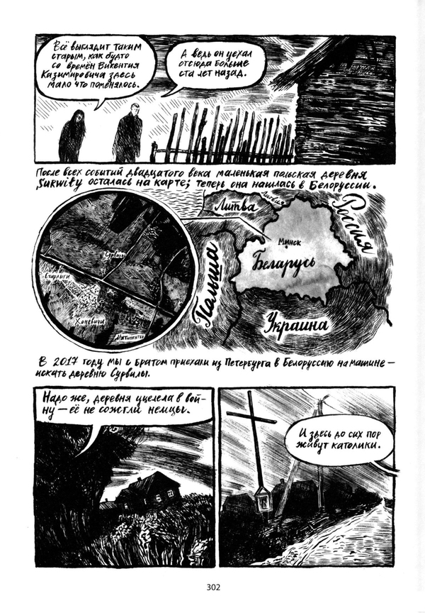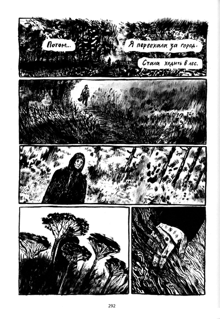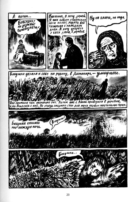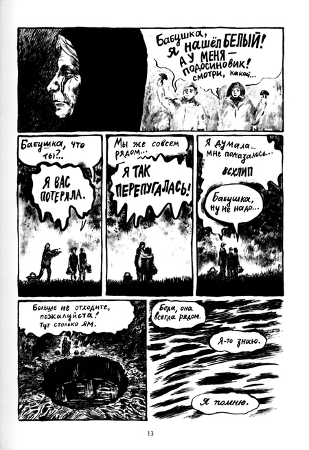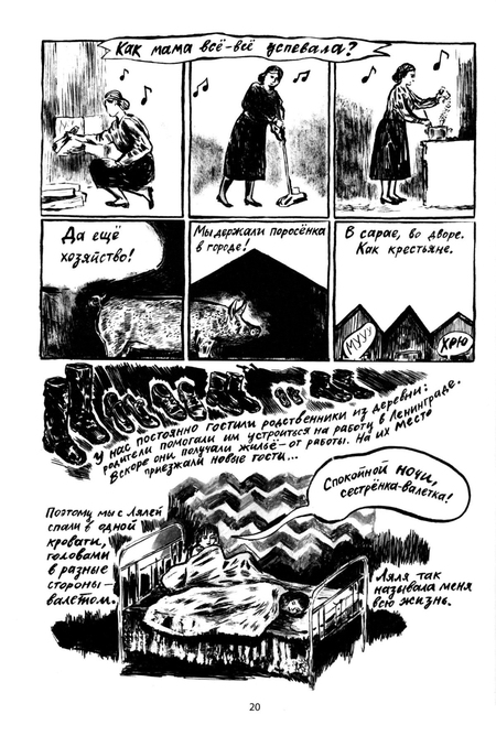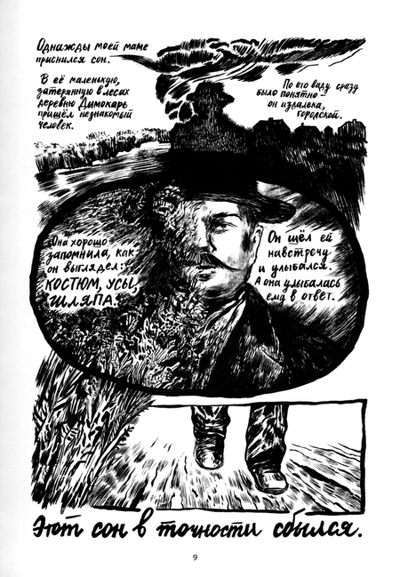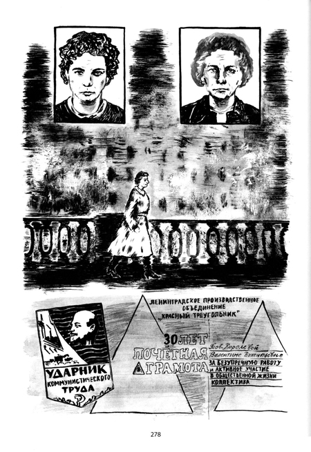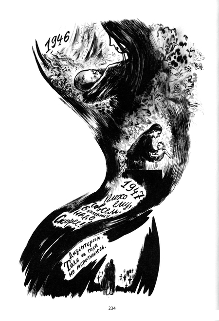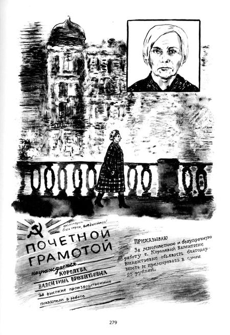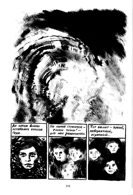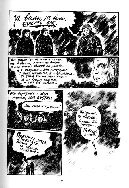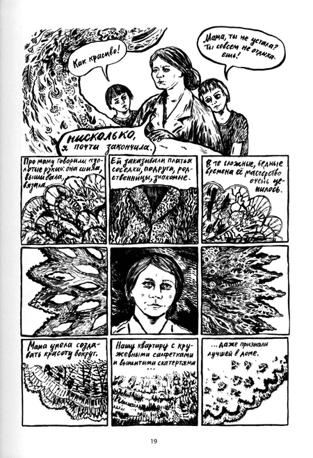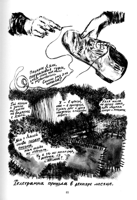 Ольга Лаврентьева действует немного по-другому: ее визуальный язык более эмоциональный, интимный и документальный. Комикстистка иллюстрирует историю своей бабушки, которая прошла через блокаду Ленинграда и сталинские репрессии. Смелый ворох пятен тушью, детально прорисованные портреты, рукописный текст вместе создают ощущение, личного дневника или архивного альбома, в котором рисунок существует, как инструмент, стремящийся сохранить память поколений.