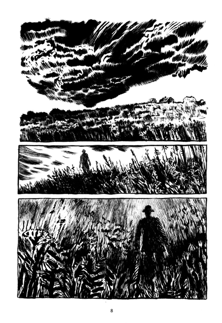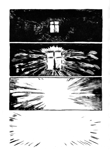 Черно-белая графика создаёт ощущение архивности и эмоциональной сдержанности. Плотная сетка панелей усиливает чувство давления, которое становится метафорой страха и невозможности выбора.