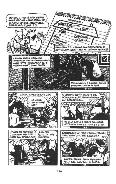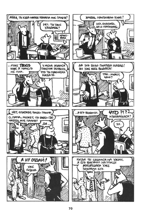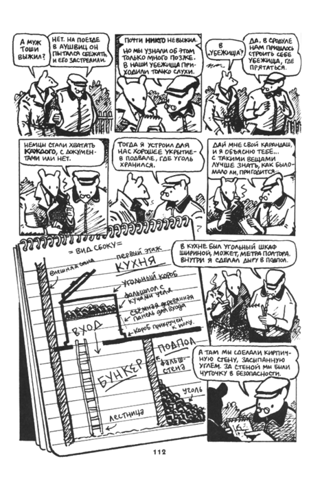 В «Маусе» Арт Шпигельман пытается раскрыть трудные отношения с отцом, и визуализирует историю своего родителя, человека, пережившего Холокост. Автор делает это через некую метафорическую систему, где каждой нации отведено свое животное. Этот прием помогает рассказывать о сложных, невыразимых вещах простым языком. Шпигельман сочетает плотную сетку панелей, контрастные линии и чёрно-белую палитру, чтобы передать тревогу, ритм и напряжение между прошлым и настоящим.