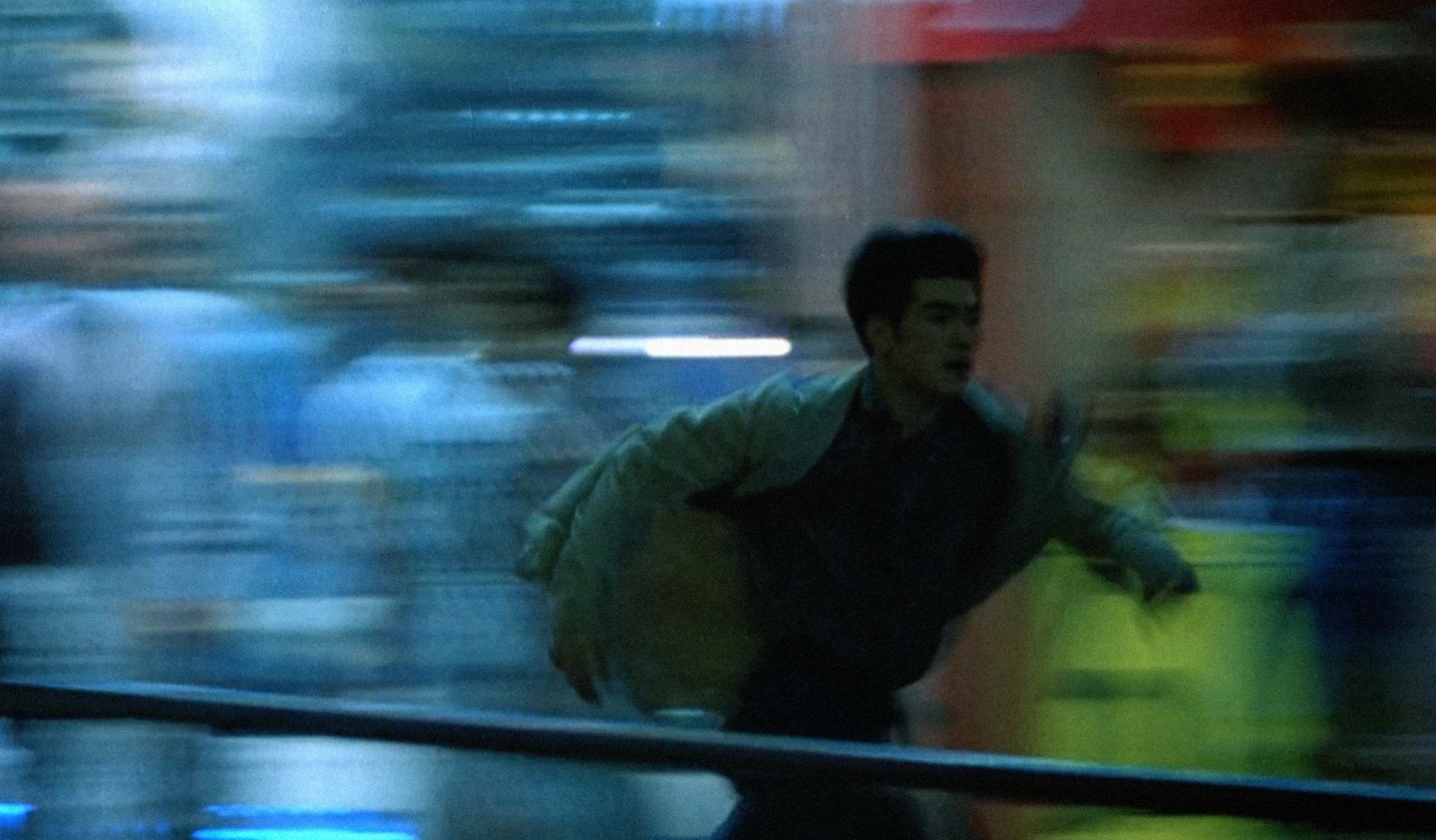 В «Чунгкингском экспрессе» пространственные разрывы становятся способом подчеркнуть хаотичность Гонконга и внутреннюю несобранность героев. Кадры через витрины, стекла киосков, отражения неоновых вывесок создают ощущение мира, который герой видит не напрямую, а через слой визуального шума. Особенно показательно это в сценах с Полицейским 663: стеклянные поверхности постоянно закрывают его частично, позволяя ощутить границу между ним и окружающей жизнью. Отражения и полупрозрачные поверхности визуально повторяют тему эмоциональной рассинхронности, когда герой словно существует рядом с миром, но не внутри него.
