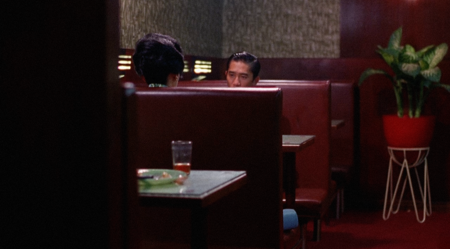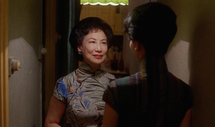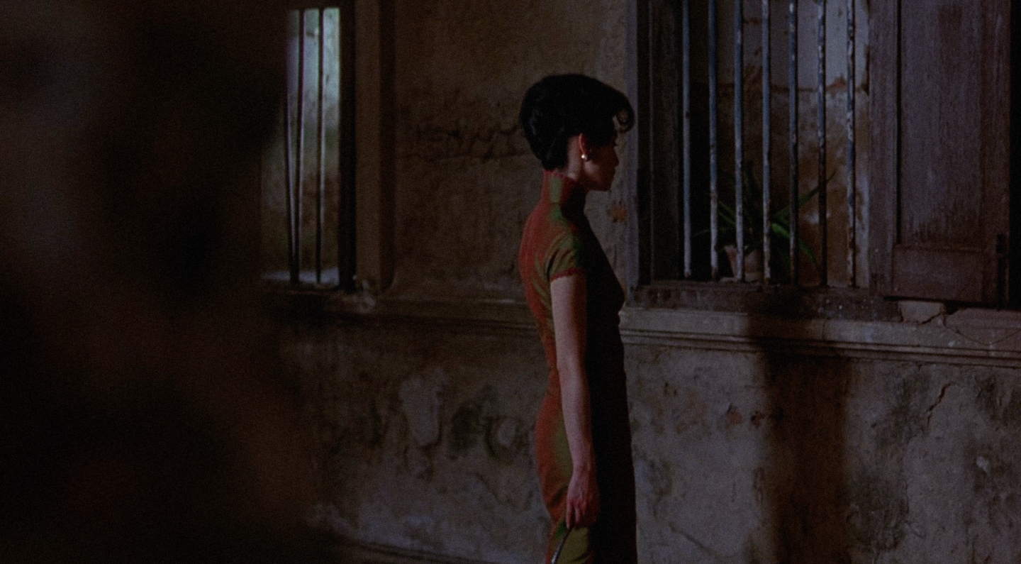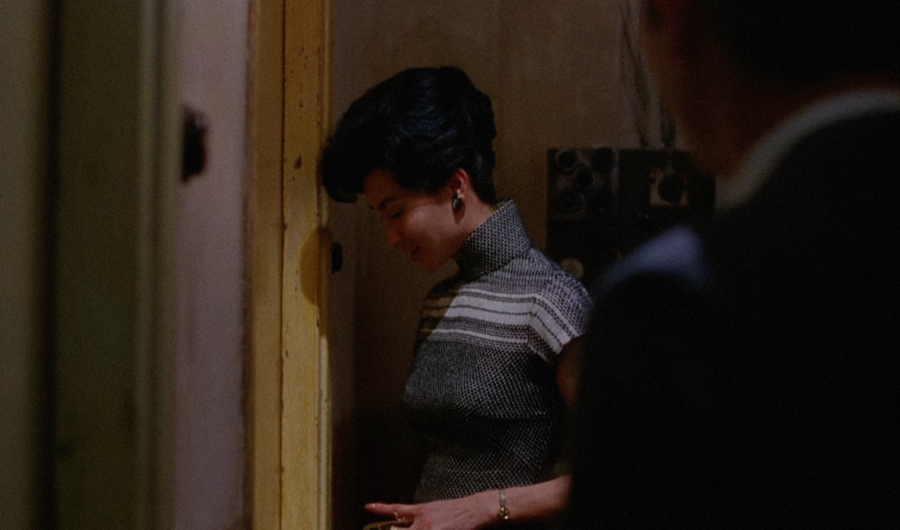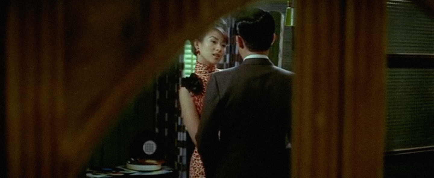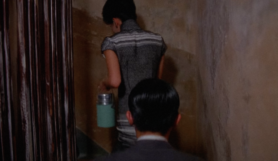 В «Любовном настроении» пространство построено на ритмических повторах и визуальной сдержанности. Узкие коридоры, двери, тканевые перегородки и зеркала формируют ощущение герметичности и недосказанности. Каждый проход миссис Чан по лестнице или узкому коридору подчеркнут рамками, которые словно не дают ей возможности выйти за пределы собственной эмоциональной сдержанности. Отражения и полукадры становятся носителями недоговоренности. В нескольких эпизодах персонажи оказываются разделены дверным косяком или стеклянной перегородкой — пространство буквально удерживает дистанцию между ними, визуализируя невозможность прямого эмоционального контакта.