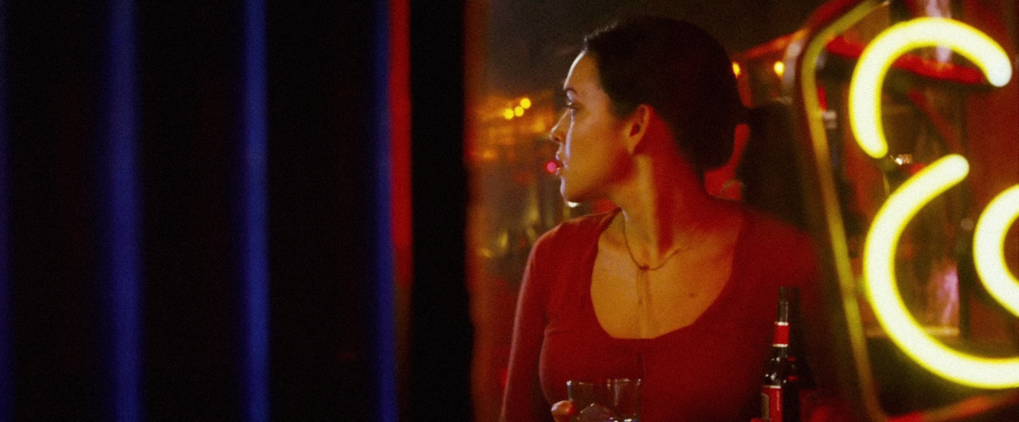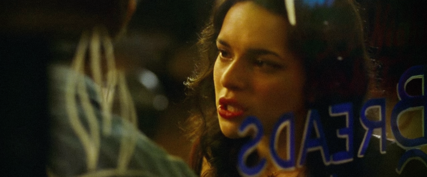 В «Моих черничных ночах» пространственная система становится проще, но сохраняет ключевой принцип Вонга Кар Вая — дистанцию между героями. Кадры через стекло кафе, отражения в витринах и зеркалах создают ощущение отделенности. В казино пространственные границы становятся более давящими: стеклянные панели, зеркала игровых автоматов и тесные проходы усиливают ощущение замкнутости, в которой живут Арни и Сью Линн.