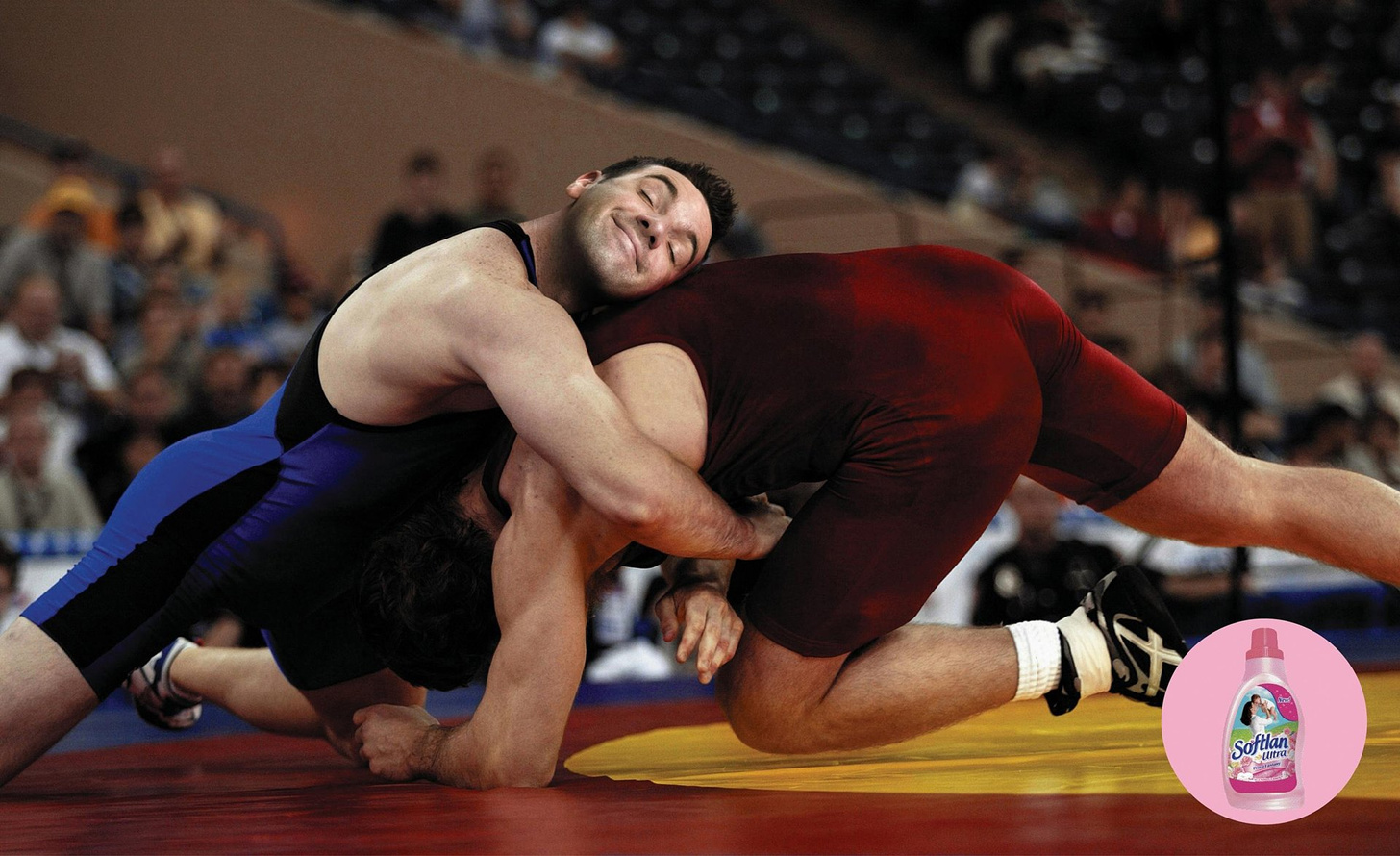 В этой рекламе продают кондиционер для белья Softlan, таким образом пытаясь сообщить читателю, что он настолько мягкий и душистый, что даже борец не может удержаться перед ним.