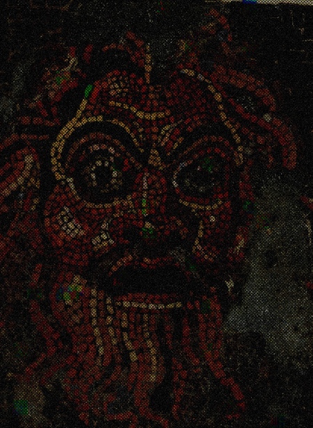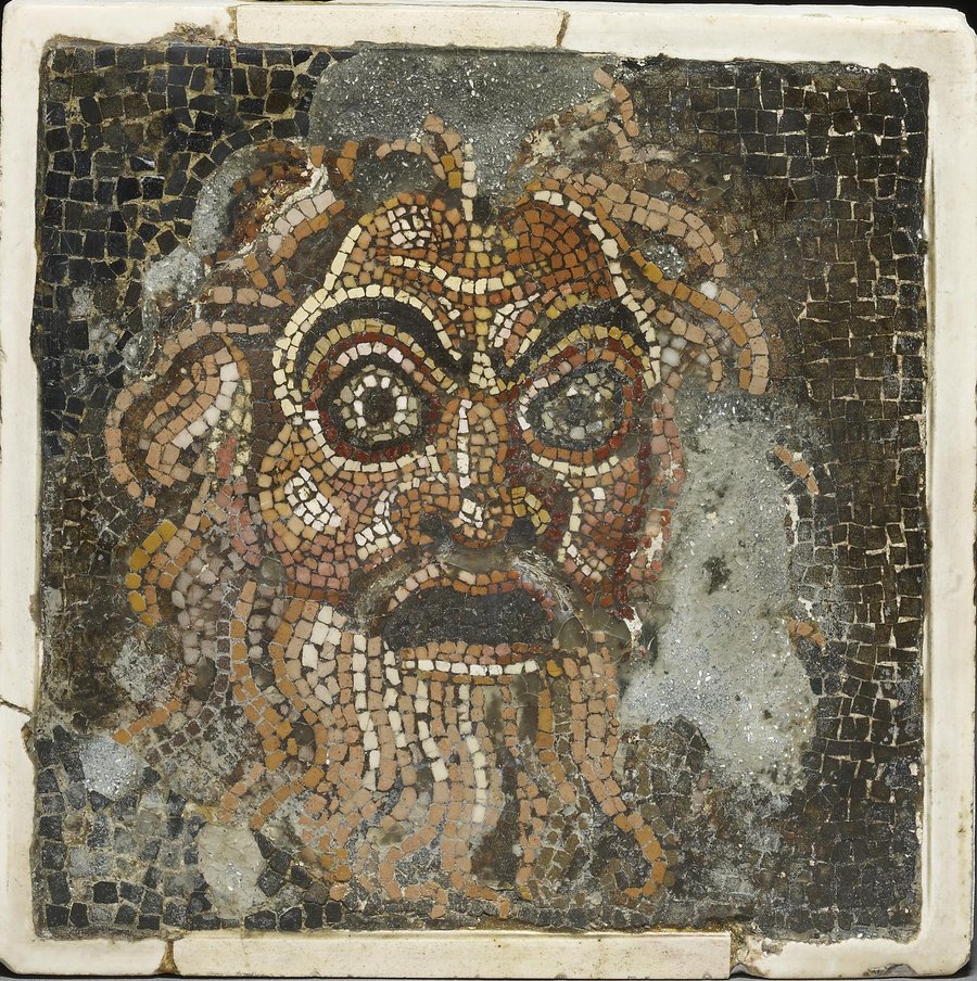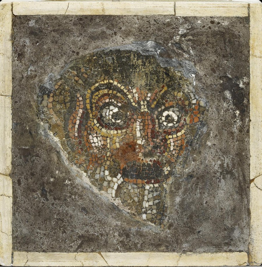 Рассмотрим еще артефакты из римской империи. Три мозаичные плитки с изображением маски из Британского музея. Здесь изображение создается уже не за счет инкрустации объемной микро-фигуры лица, а более живописно за счет сочетания маленьких осколков смальты. При том, что изображение плоское, оно выглядит объемным. Но более любопытно рассмотреть не это, а то, как устаревание материала создает эффект «истории», эффект «помех». Конечно, изначально плитки выглядели не так, но именно эффект устаревания создает особое мистическое настроение.