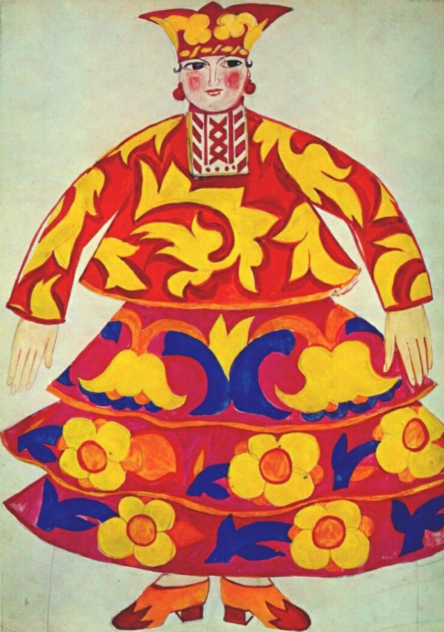 Эскиз костюма султанши к балету «Шахерезада», Бакст Л. С. (1910) Эскиз костюма для балета «Петрушка», Бенуа А. (1925) Эскиз костюма для оперы-балета «Золотой петушок», Гончарова Н. С. (ХХ век)