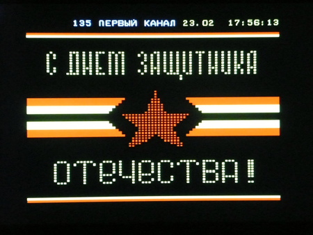 Праздничная телетекст-страница ко Дню защитника Отечества. Первый канал, 23 февраля | Заставка российской службы телетекста. ГЦРТ, Москва, 1996