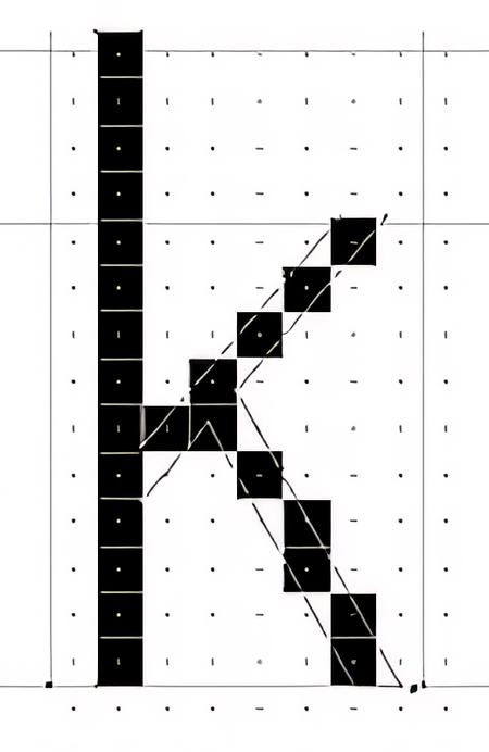 Для кириллицы ограничения сетки особенно заметны. В отличие от латинского алфавита, в котором большинство букв строится на вертикалях и горизонталях, кириллица содержит множество диагональных или сложных криволинейных элементов: Ж, Я, Ю, Д, Л, Э. В реальных реализациях советских систем и неофициальных экспериментах, эти буквы подвергались радикальной геометризации. Ж превращалась в почти симметричную пиксельную «икону», а буква Я теряла характерную мягкость нижней ножки, превращаясь в единый угловатый контур. Таким образом, сетка влияла не только на читаемость, но и на визуальную идентичность алфавита.