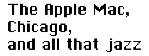 Ранние компьютерные гарнитуры воспроизводили тот же принцип «буквы как мозаики». Шрифт Chicago (Macintosh, 1984), разработанный Сьюзен Каре, использовал матрицу, близкую по духу телетекстовой: прямые штрихи, ступенчатые диагонали и моноширинная логика внутри интерфейса. Geneva и Monaco развивали те же приёмы — упрощённые округлости, крупные пиксельные апертуры и укрупнённые контрастные элементы, повышающие читабельность на низком разрешении. В системе Windows аналогичную роль выполняли MS Sans Serif (8×8 / 8×16) и Terminal, стилистически родственные Videotext-сетке.