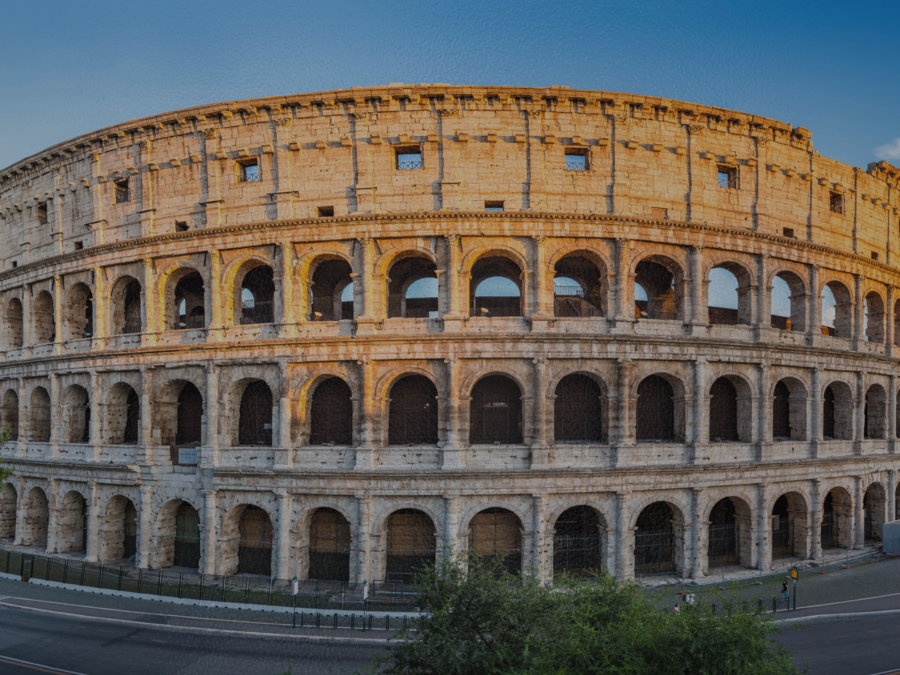 Самое известное и величественное здание Великой Римской империи также использует круглые (полукруглые) арки. Как и в случае с триумфальными арками и акведуками, энергия конструкции Колизея направлена вниз, к земле, что создаёт ощущение незыблемой стабильности. Бесконечное круговое повторение арок формирует чёткий ритм, рождающий чувство порядка и мощи — отличительные черты имперской архитектуры. Кроме того, выбор этой конструкции был напрямую обусловлен первоначальной задачей сооружения — выдерживать колоссальный вес тысяч зрителей, и с этой инженерной целью полукруглая арка была наиболее оптимальным и эффективным решением.