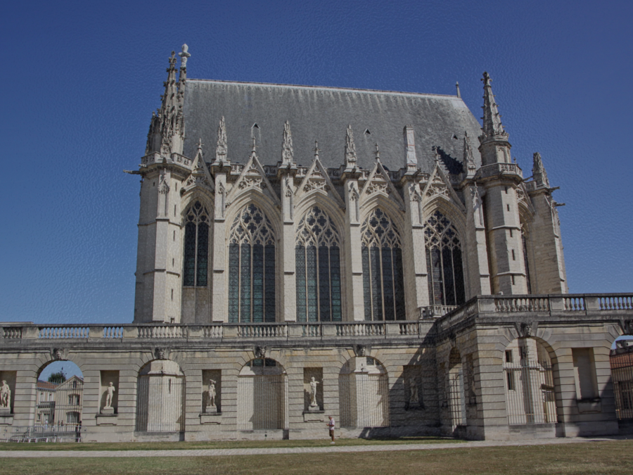 В Сент-Шапель (Святая капелла, Париж) готическая архитектура совершает качественный скачок, достигая своей логической кульминации. Здесь происходит окончательное превращение стены в каркас, и здание превращается в гигантский реликварий, наполненный божественным светом.