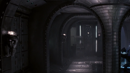 Также стоит упомянуть внутреннее устройство и вид корабля и их влияние на создание необходимой для понимания замысла атмосферы. В качестве первой важной детали можно выделить материалы, из которых сделан корабль. Металл выглядит старым, даже кое-где заржавевшим. Хотя помещения внутри корабля выглядят вполне современными: хорошо оборудованный медицинский отсек, хорошо технически оснащенные коридоры и переходы, технические и основные комнаты, ощущение запустения и некоторой опасности, созданное за счет небольшого состаривания материала и использования преимущественно темных цветов и минимального освещения в помещениях, сохраняется.