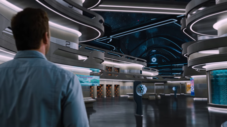Говоря о внутреннем строении «Авалона», следует обратить внимание на то, как внимание зрителя акцентируется на подчеркнутой технологичности корабля, а также на факте отсутствия растений где-либо на борту, помимо научных лабораторий. Это не вызывает вопросов с функциональной точки зрения: пассажиры недолго пробудут на корабле, необходимы дополнительные затраты на уход за растениями, и, что наиболее важно, замкнутое, ограниченное пространство, площадь которого должна быть использована наиболее рациональным образом, а в условиях длительного криогенного сна всех людей на борту контролировать рост растений не представляется возможным. Однако если рассматривать это с точки зрения человека и его взаимодействия с кораблём, прослеживается мысль о том, что человек не может долго жить в стерильных условиях, не имея в поле зрения ничего, связанного с природой и дающего пространству ощущение жизни и даже некоторой одушевленности.