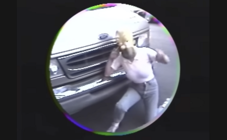 В одном из ключевых моментов героиня появляется перед автомобилем. Картинка выглядит так, будто её сняли на старый бытовой видеомагнитофон: изображение слегка «плывёт», а в темных участках появляется зерно. Такой кадр создаёт ощущение, что зритель наблюдает за незнакомкой издалека, как будто случайно наткнулся на запись, где она что-то переживает, но мы не знаем, что именно. Маска делает сцену одновременно забавной и тревожной.