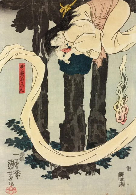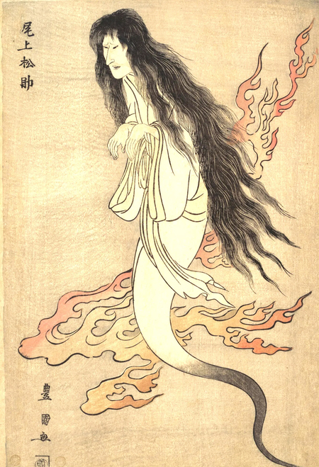 Оноэ Мацусукэ в образе призрака убитой жены Оивы в «Ужасная история со станции Ёцуя на дороге Токайдо», 1812 г., худ. Утагавы Тоёкуни и призрак Окуки на гравюре 1850 г., худ. Утагава Куниёси