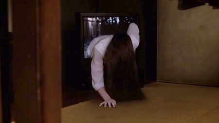 Критическая трансформация образа происходит в фильме «Звонок» (1998, реж. Хидео Наката), где Садако становится воплощением одновременно онрё и медийного вируса. В отличие от классических призраков, её мстительность связана не с конкретным нарушением семейной гармонии, а с более абстрактным чувством социальной изоляции, которое порождает конфликт между технологическим миром и человеческими эмоциями. Её функция — не столько наказание, сколько распространение тревоги, страх как эпидемия, что делает фантомный женский образ частью современной концепции распространения информации. Сцена её выхода из телевизора не только разрушает границу между мирами живых и мёртвых, но и делает акцент на том, как медиа-потоки становятся новыми пространствами для существования призраков.