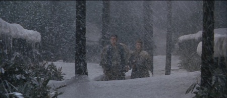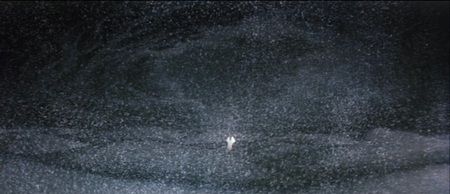 В фильме «Кайдан» (1964, реж. Массаки Кобаяси) визуальный стиль достигает максимальной театрализованности. В новелле «Женщина в снегу» Юки-онна предстает как почти плоская фигура, растворённая в белом пространстве метели. Лицо её лишено теней, глаза — тёмные точки на бледном лице, волосы — чёрная вертикаль, резко контрастирующая с белизной пространства. Кобаяси использует цветовые контрасты как главный инструмент визуализации духа: абсолютная белизна снегопада и холодный свет ламп превращают Юки-онну в фигуру, которая словно вырезана из пустоты. Фантомность проявляется не только через её неподвижность, но и через отсутствие следов на снегу — важный визуальный символ, связанный с представлением о призраке как о существе, не взаимодействующем с материальным миром.