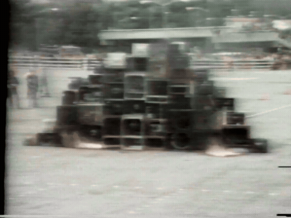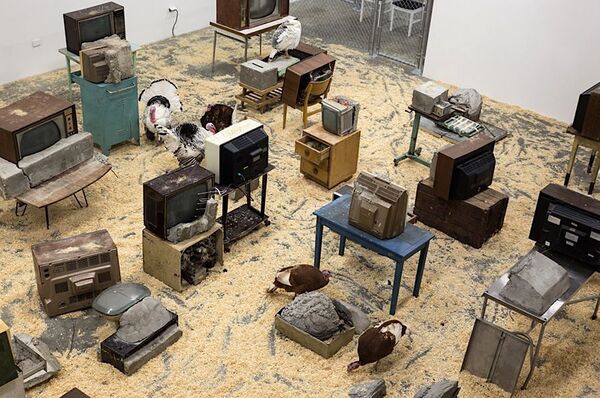 Далее хочется обратиться к работам Фостеля Вольфа. Он также использует сразу много телевизоров, создает из них хаос и не дает нам сфокусироваться на каком-то конкретном девайсе или даже действии. В работе всё скрежечет и перемещается, мы стараемся понять что вообще происходит, и у нас точно не возникает желания обратиться к телевизору. Он теперь либо часть работы, либо что-то второстепенное, его роль заметно снижается по сравнению с той, которую он занимает в стенах дома.