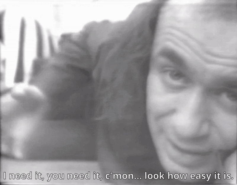 В этой точке важно вспомнить Вито Аккончи — одного из первых художников, кто вошел в контакт со зрителем через экран. Не важно при этом какие приемы он использует: метафоричное указание в центр экрана в работе «Центры» (1971) или напрямую обращение к зрителю через экран, как в «Загланой песне» (1973).