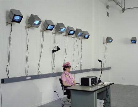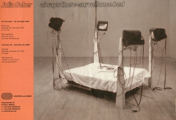 В инсталляциях Джулии Шер — «Охрана от Джулии II» (1989) и «Кровать наблюдения III» (2000) темя наблюдения представлена через призму критики современных систем контроля и слежки — камер, которые повсеместно следят за гражданами в городах. Работы Шер обращают внимание на политику наблюдения, раскрывая её механизмы и порождаемые ей социальные напряжения. Эта тема — одна из важных в культуре и искусстве, она находит разные отражения и интерпретации, и далее мы увидим, как её продолжают развивать другие авторы.
