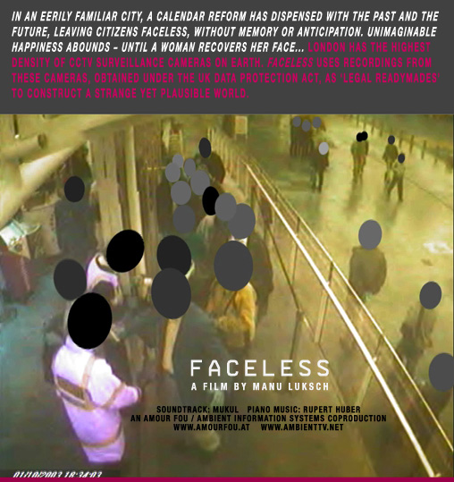 Фильм «Безликие» (2007) режиссёра Ману Лукша расширяет границы видеоарта, используя материалы камер видеонаблюдения для создания игрового фильма. В отличие от документального подхода Магид, «Безлики» разворачивает на экране сюжет и действия персонажей, снятых исключительно с помощью уличных камер. Этот проект стирает грань между фикцией и документальностью, задавая вопросы о приватности и публичности в современном обществе, а также о роли наблюдения в формировании визуального и нарративного опыта.