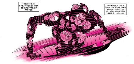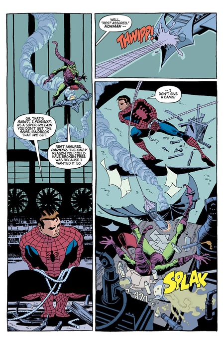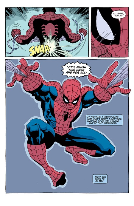 Одним из наиболее знаковых моментов в комиксах про Человека-Паука является отказ Питера от костюма супергероя. Можно заметить, как общая мрачность кадра контрастирует с яркостью костюма, лежащего в мусорном ведре. Эта панель показывает, что дуальность личности персонажа может оказывать сильное давление на него без костюма, и, несмотря на внешнюю самоуверенность супергероя, вводит Питера без суперкостюма в меланхоличное и депрессивное состояние.