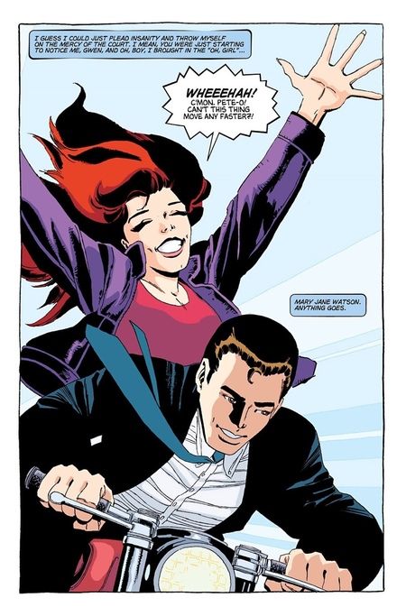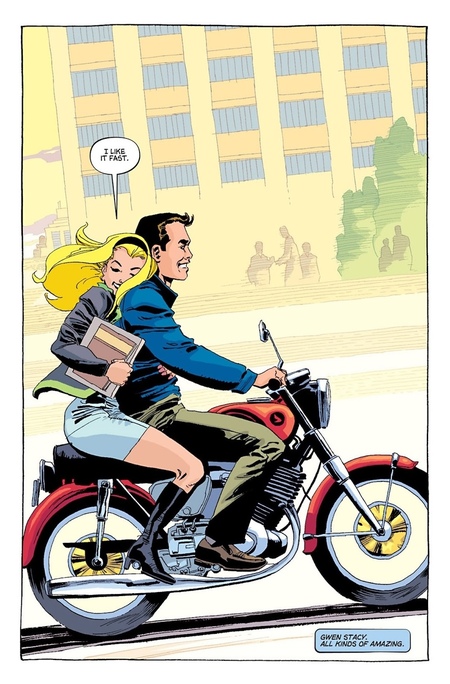 Можно заметить, что даже в сценах, где Питер Паркер едет на мотоцикле, динамика и энергичность кадра намного меньше, чем на панелях с Человеком-Пауком. Фигура героя не выходит за границы рамки, а на фон сохраняется минималистичным, без большого количества деталей.