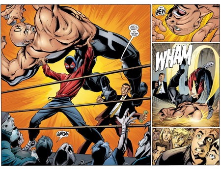 На панелях слева Питер представляется как супергерой в маске, его движения более резкие и театрализованные. Сила героя представляется как нечто «нечеловеческое». Дополняют кадры резкие контрасты и яркие фоны, которые подтверждают уверенность Человека-Паука в своей силе. По словам Скотта МакКлауда: «Даже если персонажи в сцене почти не искажены, экспрессионистский или деформированный фон в большинстве случаев влияет на наше восприятие их внутреннего состояния.» [2, С. 132]