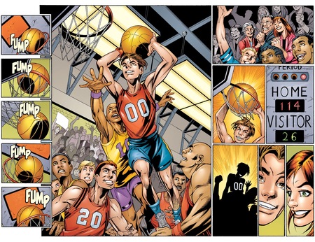 Эксперименты с динамикой и расположением панелей продолжились в выпусках серии Spider-Man Blue. Здесь наиболее широко используется изменение размеров и расположения кадров, что подчеркивает энергию в сценах с присутствием Человека-Паука. Более того, в некоторых сценах образ супергероя выходит за рамки панели, что позволяет не только подчеркнуть интенсивность действия, но и усиливает эффект его неконтролируемости, так как границы рамки считаются «неприкосновенными». [1, С. 46].