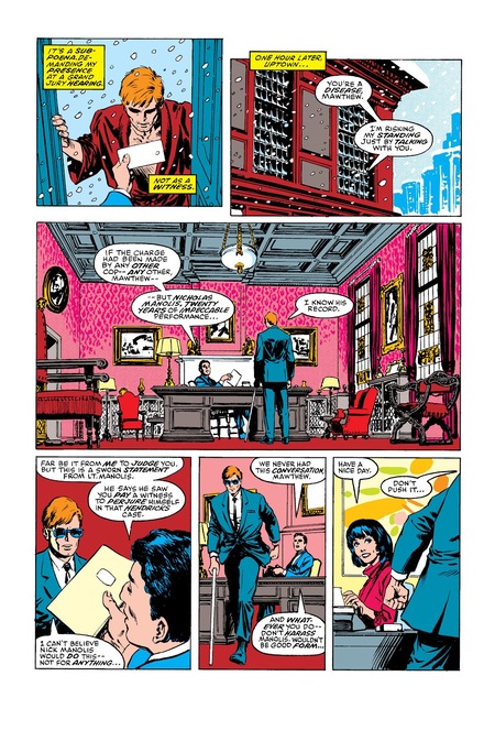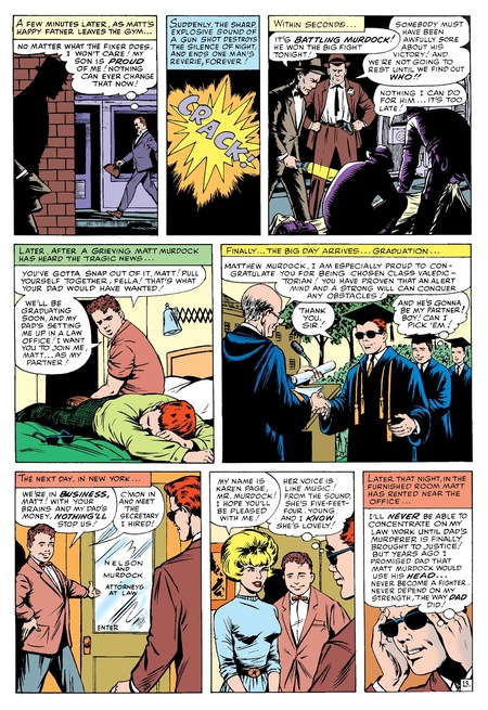 В дальнейших выпусках можно заметить изменение динамики поз героя Метта Мердкоа. В образе человека его позы спокойные и уравновешенные, чаще отражают спокойствие. В то же время, Сорвиголова занимает большую часть панели и находится в открытой динамичной позе. Это отражает как внутренняя уравновешенность и спокойствие персонажа дополняется его образом супергероя.