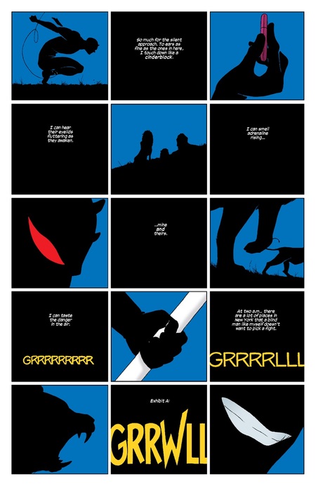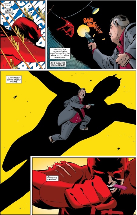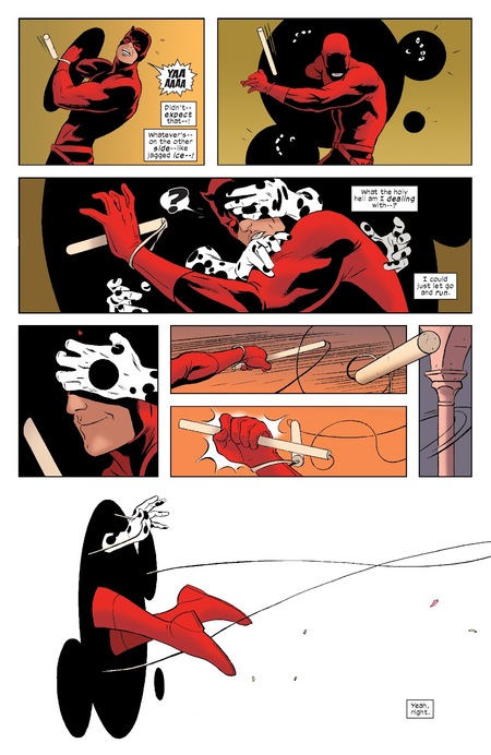 Подобные приемы используются в некоторых последующих комиксах про Метта Мердока. Минималистичное отображение фонов и иногда отсутствие цвета подчеркивают силу героя и его борьбу с использованием чувств и ощущений. Скотт МакКлауд подчеркивает, что упрощение визуальной составляющей комикса помогает переключить внимание читателя на главное в кадре, которым в данном случае является сам персонаж. [2, С. 31]