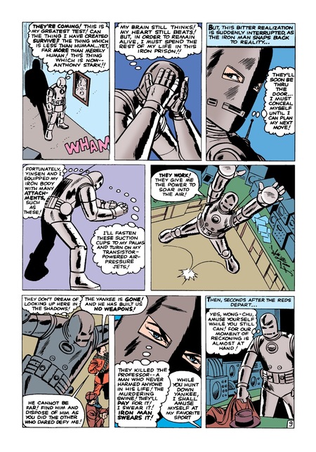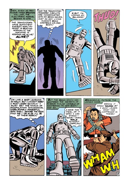 Первый выпуск про Железного Человека отличается своей концепцией от последующей истории. В то время, как в дальнейших комиксах жизнь Тони Старка поддерживалась реактором в его груди, в данном выпуске сам костюм помогал герою оставаться в живых. Персонаж испытывал большие неудобства и страдания не имея возможности снимать костюм. Это отражено в визуальном оформлении комикса. В исследовании Табиты Роуз-Энн Зараты отмечается, что такие элементы, как цвет, линии, текстуры и ритмы создают и формируют тела персонажей, их движение, а также их отношения с фоном и окружающими визуальными элементами текста. [3, С. 39]. В данном примере можно заметить, как резкие линии и скованные позы подчеркивают дискомфорт героя.