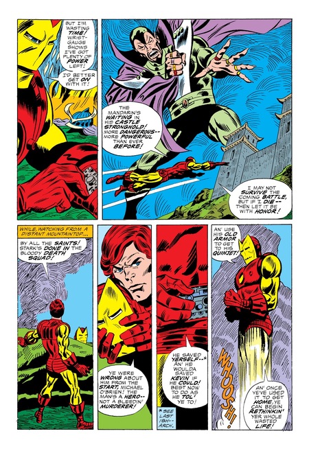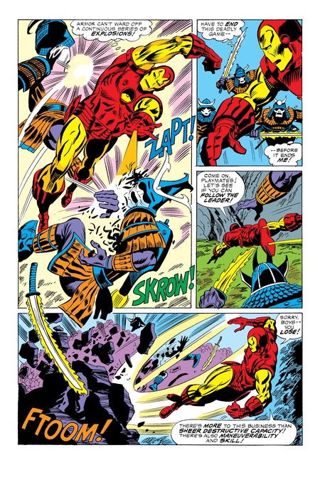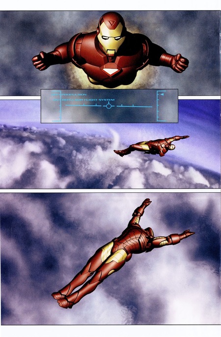 В дальнейших выпусках со сменой костюма движения становятся более плавными и динамичными. Можно заметить, что по сравнению с яркими фонами, присущими комиксам про Человека Паука, и однотонными, которые наблюдались в выпусках про Сорвиголову, в данном комиксе фоны разнообразные, наполненные движением и мелкими деталями. Такое изображение отражает полет Железного Человека и его динамику.