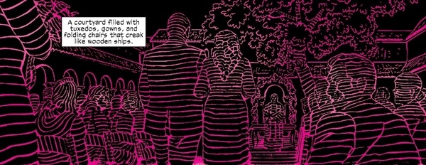 Помимо этого можно проследить изменение формы и расположения панелей. Ровные квадратные кадры слева сменяются большими и горизонтальными справа и на замену спокойной горизонтальной композиции приходит диагональная динамика.