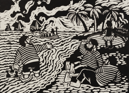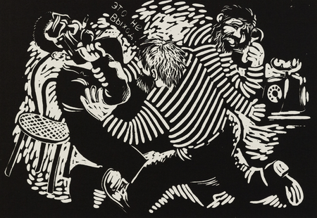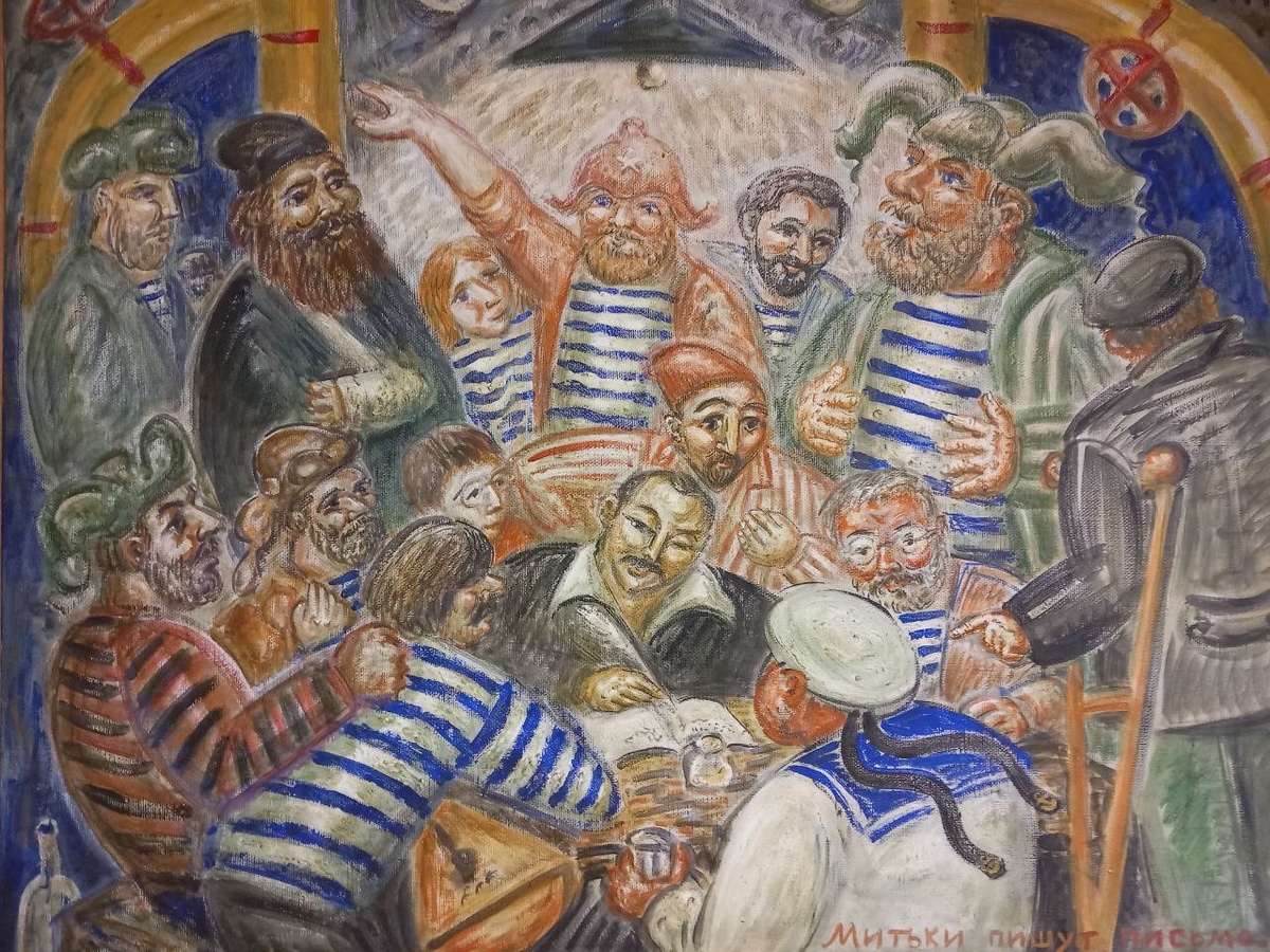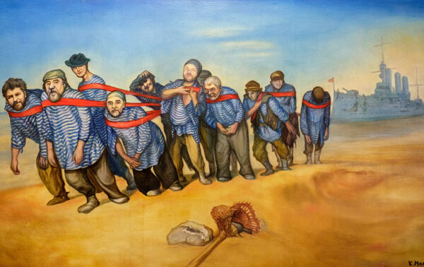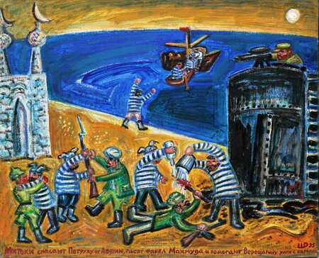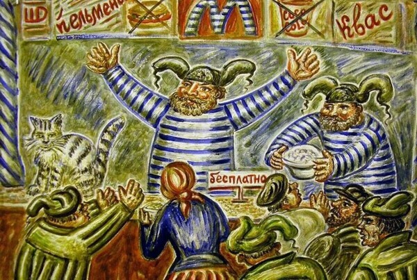 «Митьки на Неве» / Кирилл Миллер / выставлена в 2018 // «Митьки спасают Петруху от Абдулы, гасят факел Махмуда и помогают Верещагину уйти с баркаса» / Дмитрий Шагин / 1995